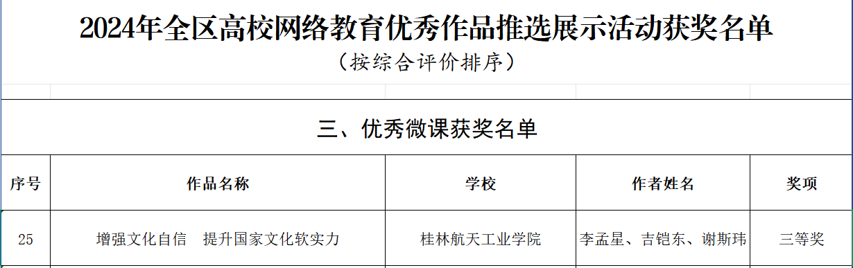 近日,根据自治区教育厅、自治区党委网信办联合下发的《自治区教育厅 自治区党委网信办关于公布第十届全区大学生网络文化节和2024年全区高校网络教育优秀作品推选展示活动获奖名单的通知》(桂教思政〔2024〕30号),我校共有10项作品获奖,其中fun88乐天使李孟星老师主讲的《增强文化自信 提升国家文化软实力》荣获优秀微课三等奖。