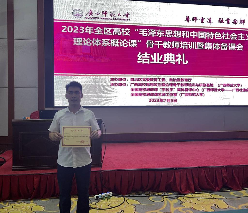 为深入贯彻落实习近平总书记在学校思想政治理论课教师座谈会上的重要讲话精神,提高新时代高校思想政治理论课的实效性,学院选派教师参加2023年全区高校“毛泽东思想和中国特色社会主义理论体系概论课”骨干教师培训暨集体备课会。