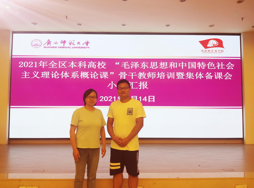 为了进一步提升我区高校思想政治理论课教师队伍建设,不断提高思想政治理论工作水平,由自治区教育工委、教育厅主办,广西师范大学马克思主义学院承办的2021年全区本科高校“毛泽东思想和中国特色社会主义理论体系概论课”骨干教师培训暨集体备课会于9月11日至16日在桂林举行,fun88乐天使教师张耀荣、罗辉参加了培训会。