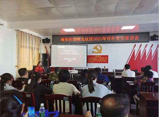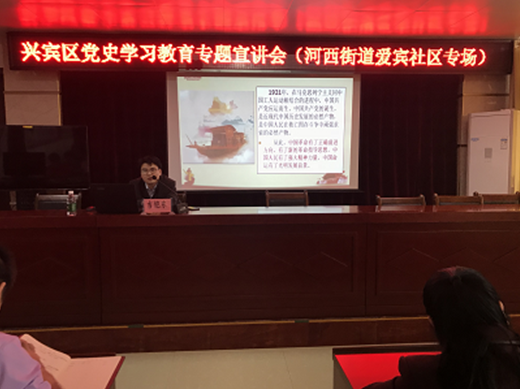 4月30日,应来宾市宣传部邀请,马克思主义学院组织教师赴来宾市开展党史学习教育宣讲活动。张君副教授、吉铠东博士分别在兴宾区城东街道镇北社区、河西街道爱宾社区等社区作主题宣讲报告。两地社区所辖党员干部及群众代表约200名参加了此次活动。