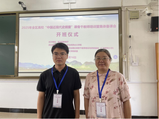 8月16日至20日,fun88乐天使教师吉铠东、曾杰丽参加了由自治区教育厅主办、广西师范大学承办的2025年全区高校“中国近现代史纲要”课骨干教师培训暨集体备课会。本次会议邀请到广西师范大学副校长汤志华,以及华南师范大学陈金龙教授、天津师范大学李朝阳教授等诸多专家学者现场授课与交流。参会教师表示,此次培训内容丰富、干货满满,从教学方法创新到科研能力提升,再到人工智能等技术在教学中的应用,都让大家收获了宝贵的知识与经验,对今后“中国近现代史纲要”课教学工作有着重要的指导意义。